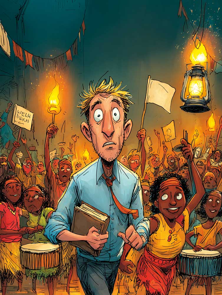 Mais à peine entré, il tombe sur trois tambours, deux dialectes, et une sœur qui l’accueille chaleureusement en lui parlant vingt minutes… dans une langue qu’il ne comprend pas.