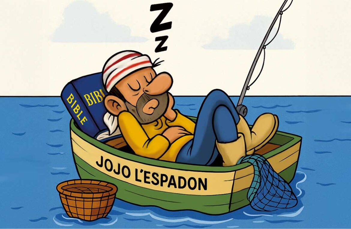 “Je suis en colère, je ne peux donc pas pêcher. C’est biblique.” Résultat ? Pas de poisson. Pas de dîner. Pas de sardines. Juste Jojo dans son canapé avec une couverture, des lunettes de soleil, et un verset hors contexte pour oreiller.